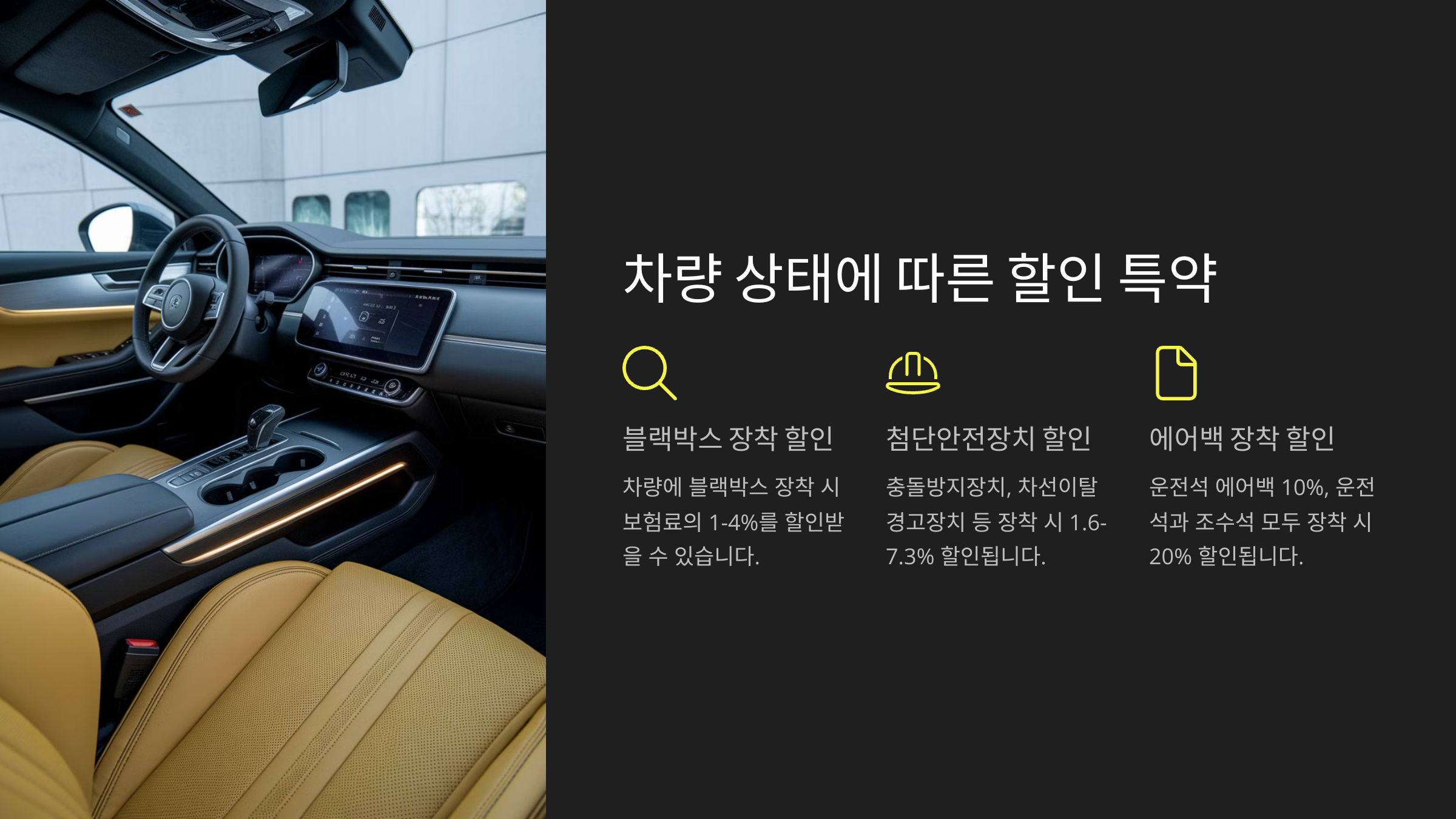 차량의 상태나 장치에 따라 보험료를 줄일 수도 있어요! 🚗 보험사들은 차량의 안전장치가 사고를 예방하는 데 도움을 주기 때문에 이런 차량을 소유한 운전자에게 보험료 할인을 제공하고 있어요.