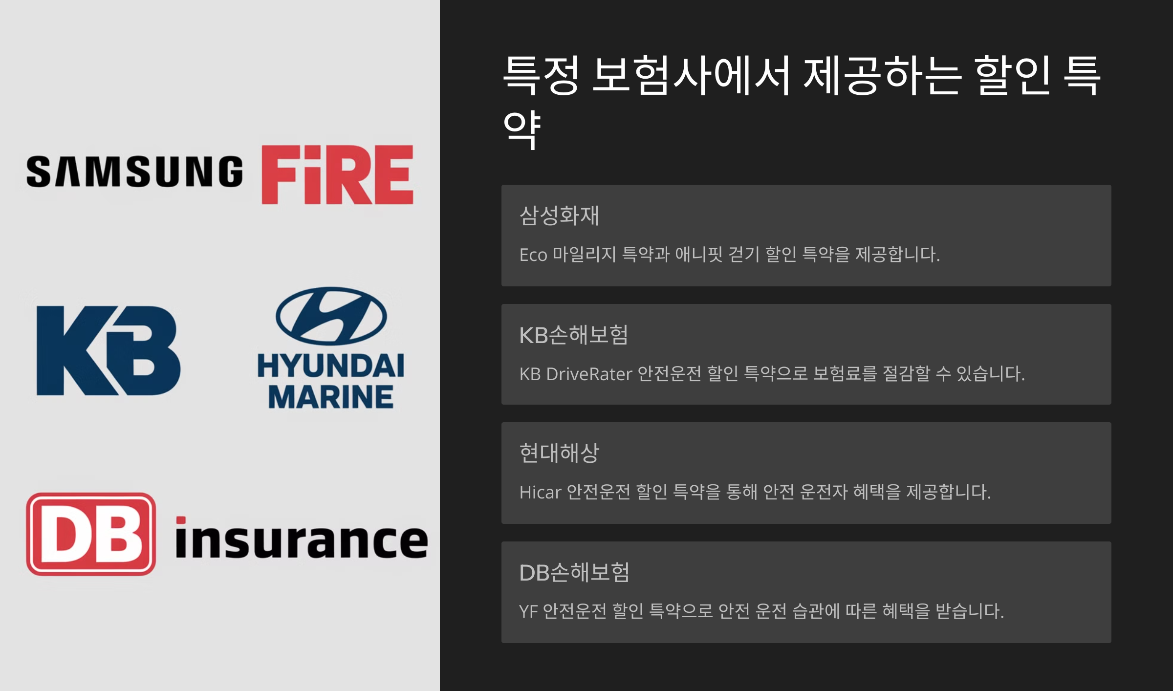 | 현대해상 | 스마트 운전 할인 | 최대 15% | T맵 & 현대차 운전 점수 |