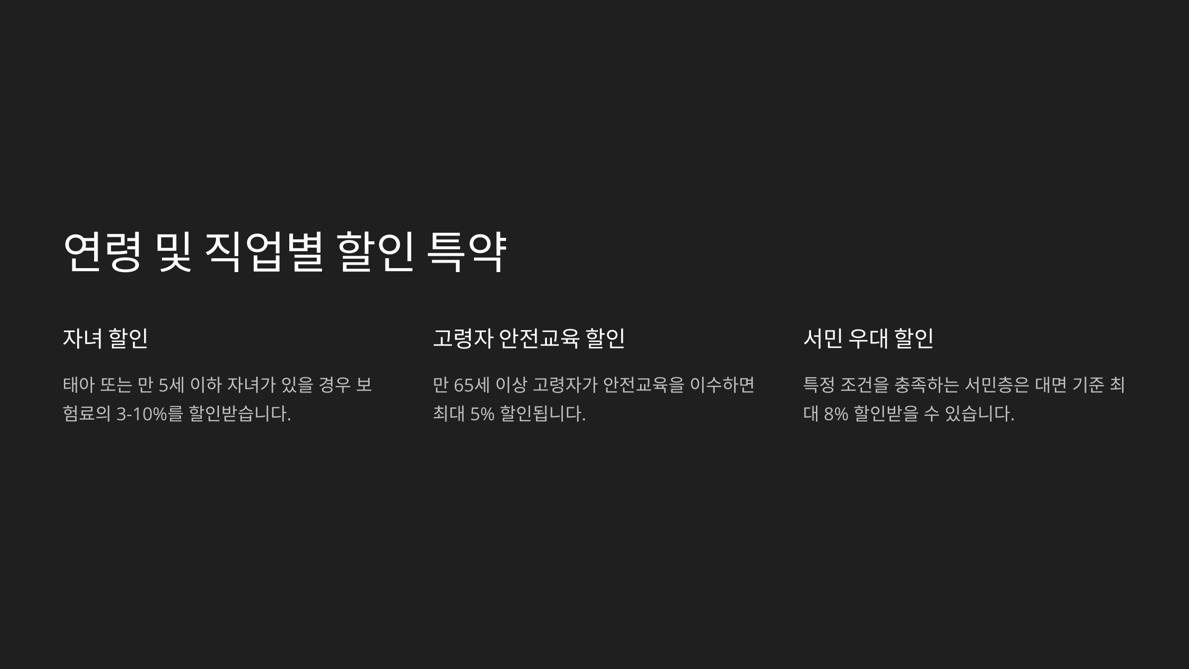 | 다자녀 할인 | 최대 10% | 만 19세 이하 자녀 2명 이상 | 삼성화재, 현대해상 등 |