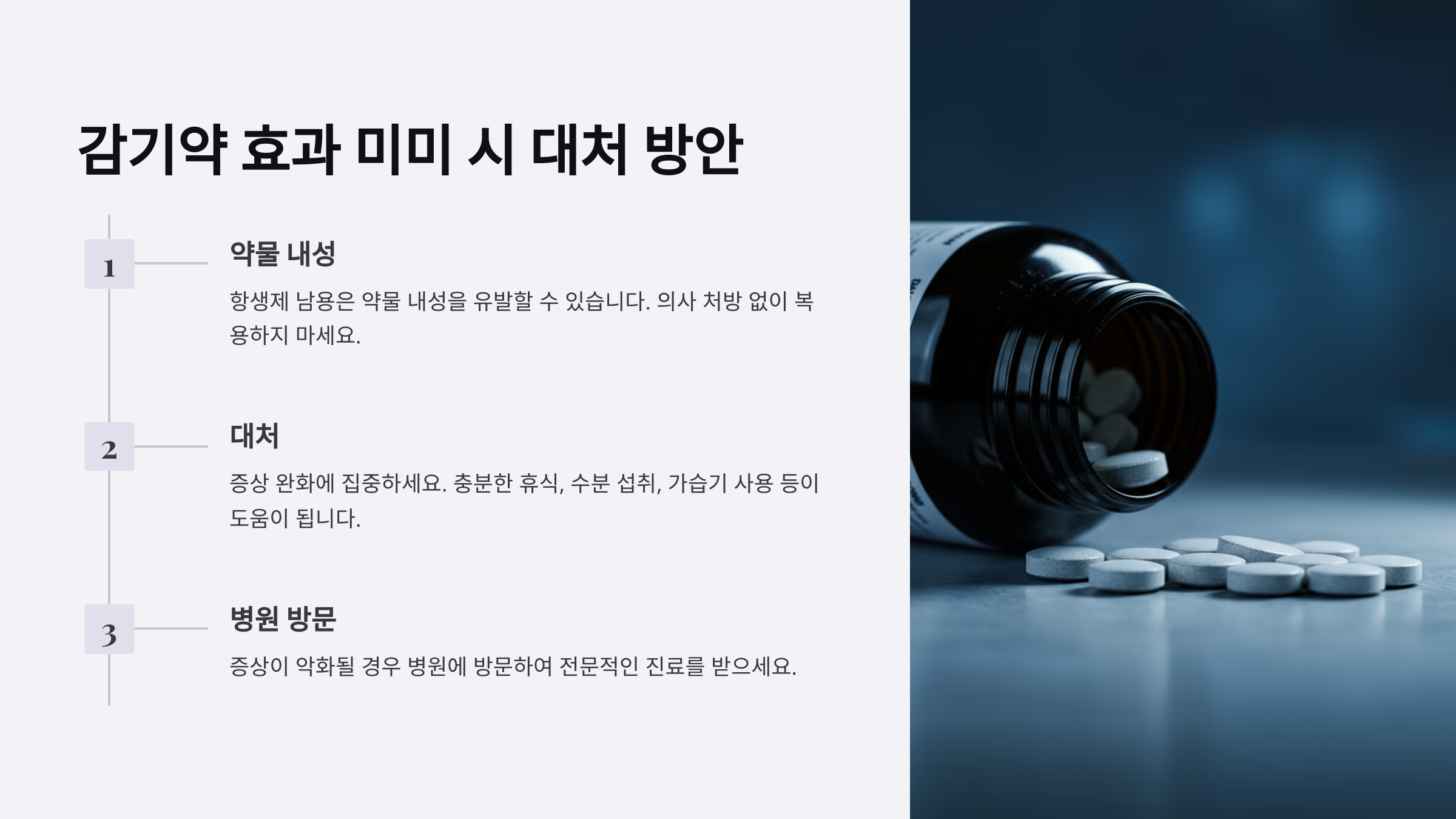 감기 증상이 심하거나 오래 지속되면 약을 먹어도 효과가 없다고 느낄 수 있어요. 하지만 감기약은 증상을 완화하는 역할을 할 뿐, 감기를 직접 치료하는 것은 아니에요. 🤔