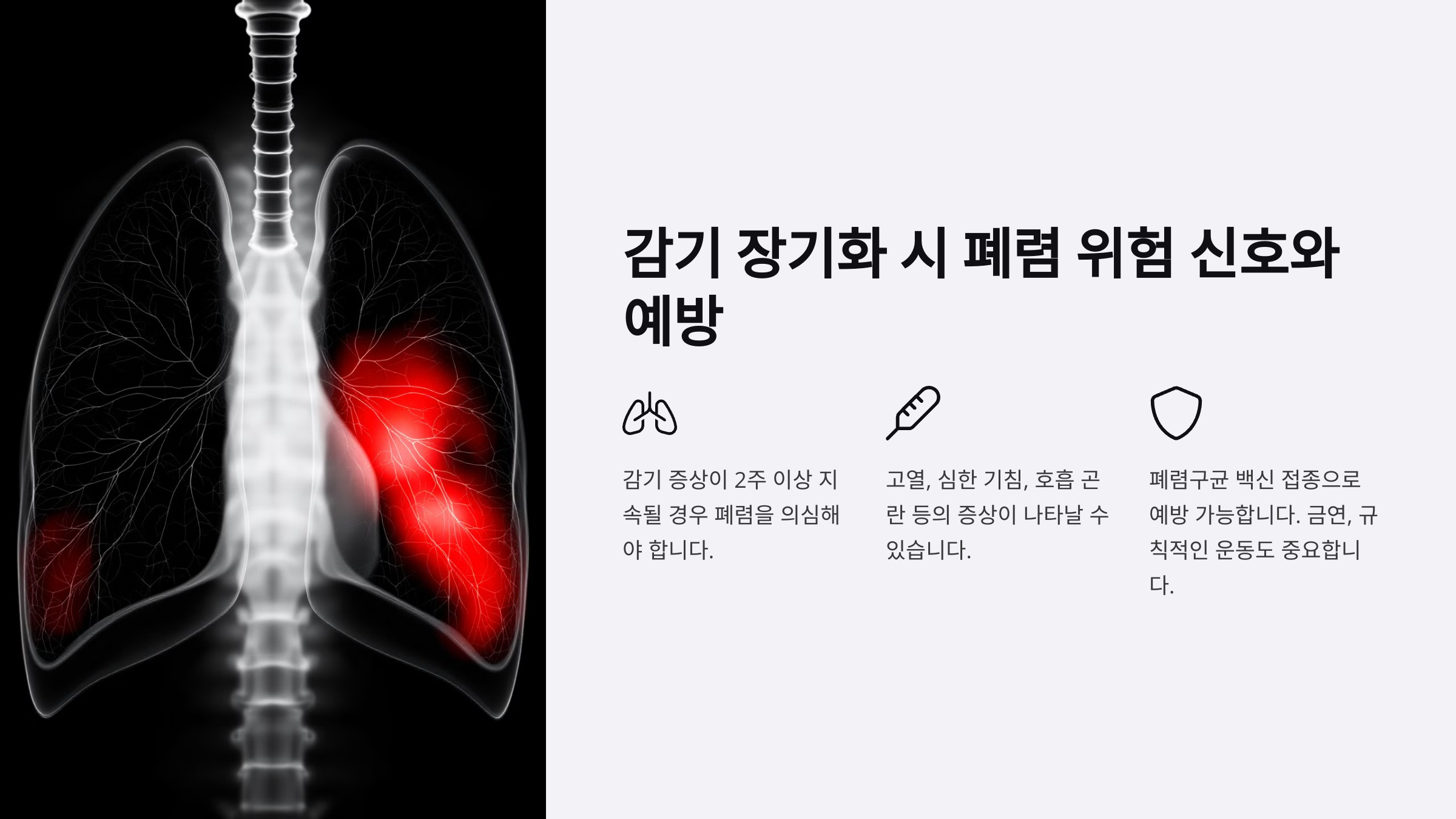 감기가 심해지면 폐렴으로 발전할 수도 있어요. 감기 증상이 오래 지속될 때 폐렴 가능성이 있는지 알아볼까요? 🏥