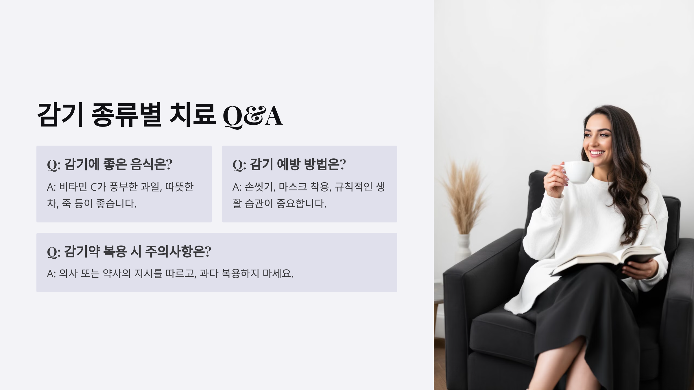 감기약을 먹어도 효과가 없을 때는 무리해서 버티지 말고 병원에서 정확한 진단을 받는 것이 좋아요. 이제 감기 종류별 치료법과 관련된 자주 묻는 질문(FAQ)을 살펴볼까요? 🧐